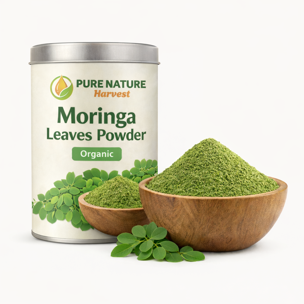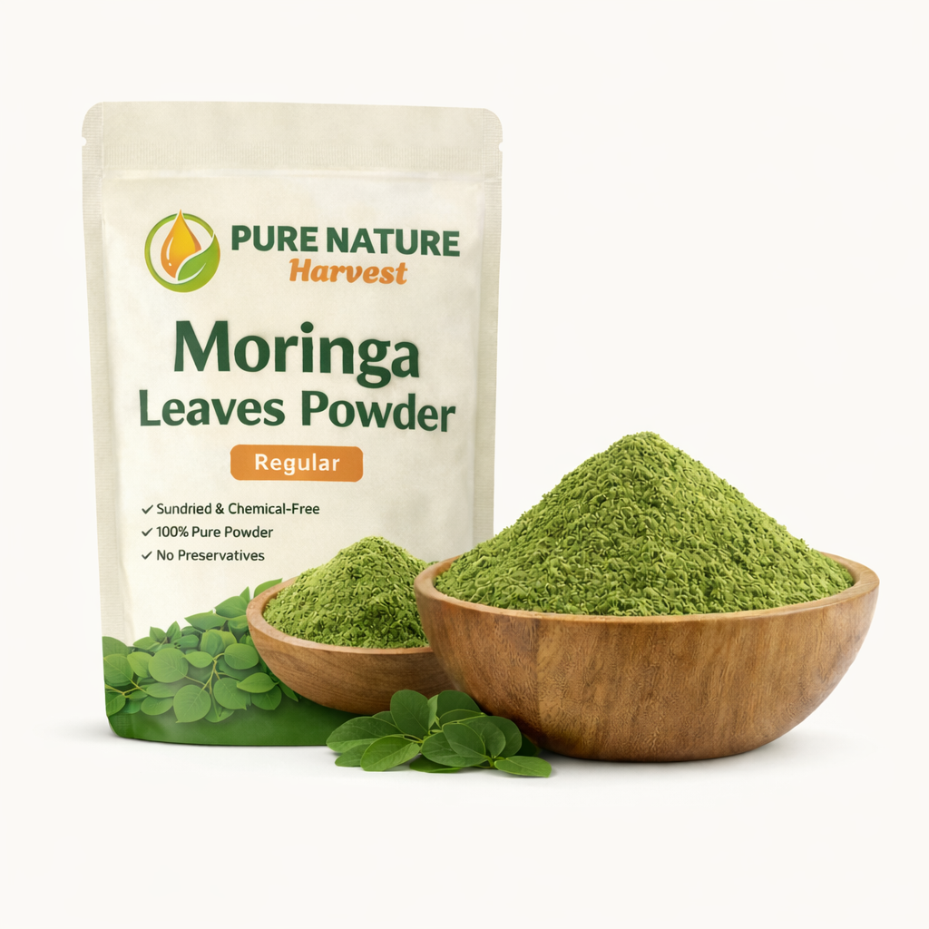 Pure Nature Harvest Moringa Leaves Powder is produced using fresh and handpicked moringa (drumstick) leaves that are obtained at reliable farms. The leaves are carefully washed, dried at low temperatures and thoroughly and evenly ground to maintain the natural green color, aroma and nutritional value of the leaves.