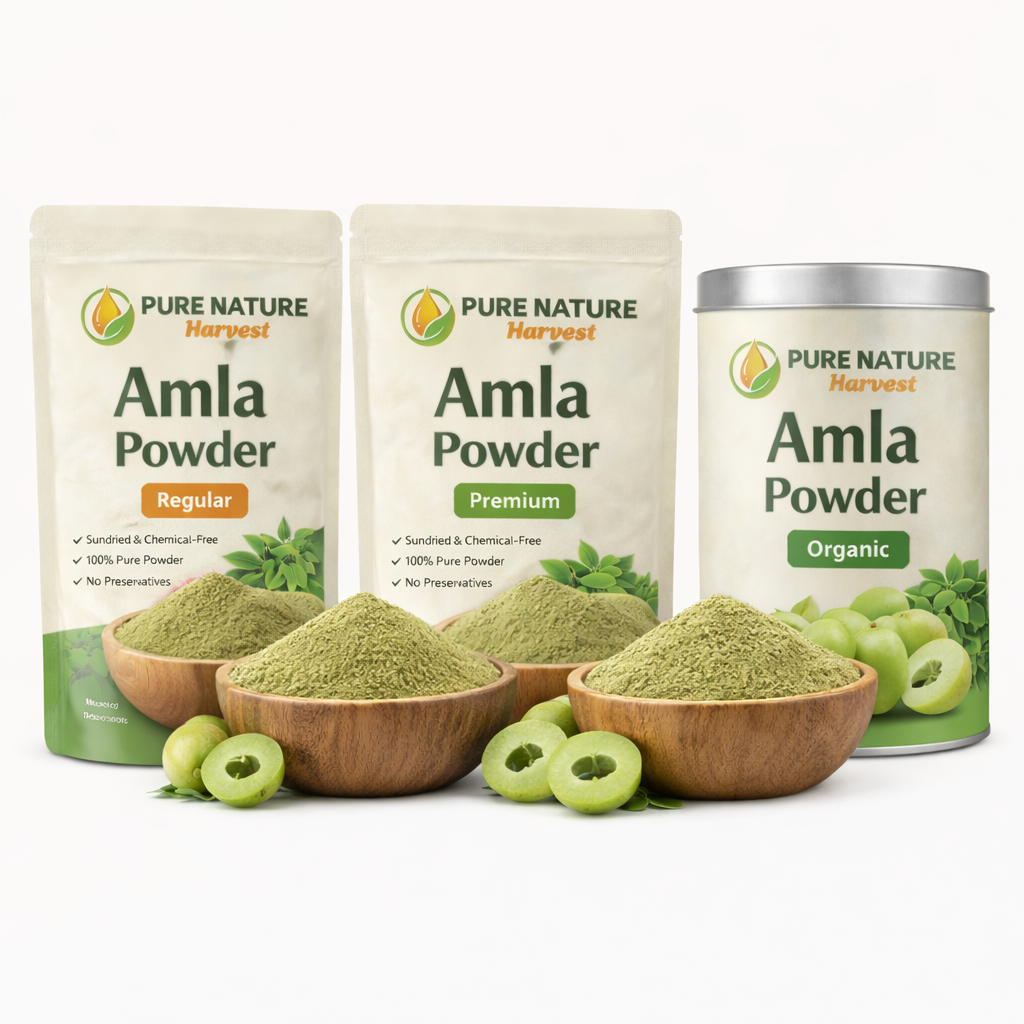 Pure Nature Harvest Amla Powder is prepared from carefully selected Indian gooseberries that are gently dried and finely ground to retain natural nutrients, taste, and aroma. Free from preservatives, additives, fillers, or artificial colors. Suitable for daily wellness and traditional hair care use.